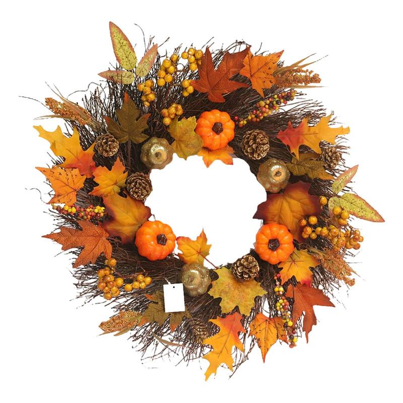 - DESIGN: The pumpkin, fiery-colored maple leaves, and berries in the front door wreath, which is fashioned on a solid vine base and has superb visual and tactile impacts